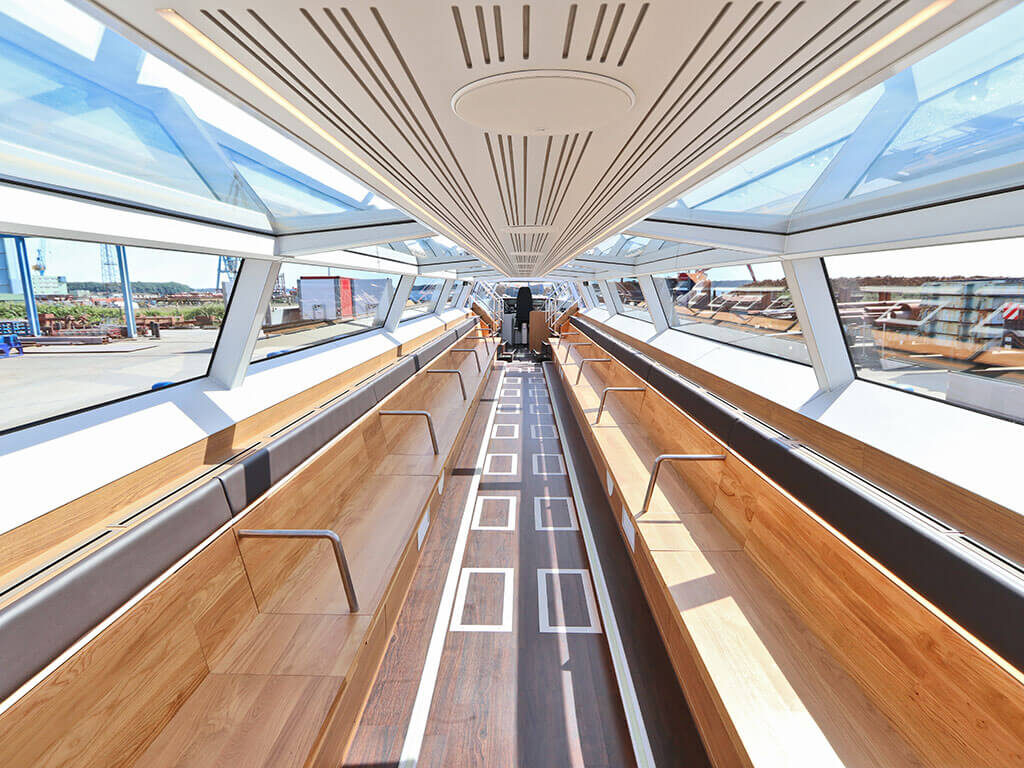 Die ASP-60-M ist die konsequente Weiterentwicklung des bewährten Modells ASP-60. Mit verbesserter hydrodynamischer Linienführung und noch stärker gewichtsoptimiertem Schiffskörper nutzt dieses Elektroschiff die eingesetzte Energie maximal effizient. Damit ist es ideal für den emissionsfreien Personentransport im täglichen Einsatz.